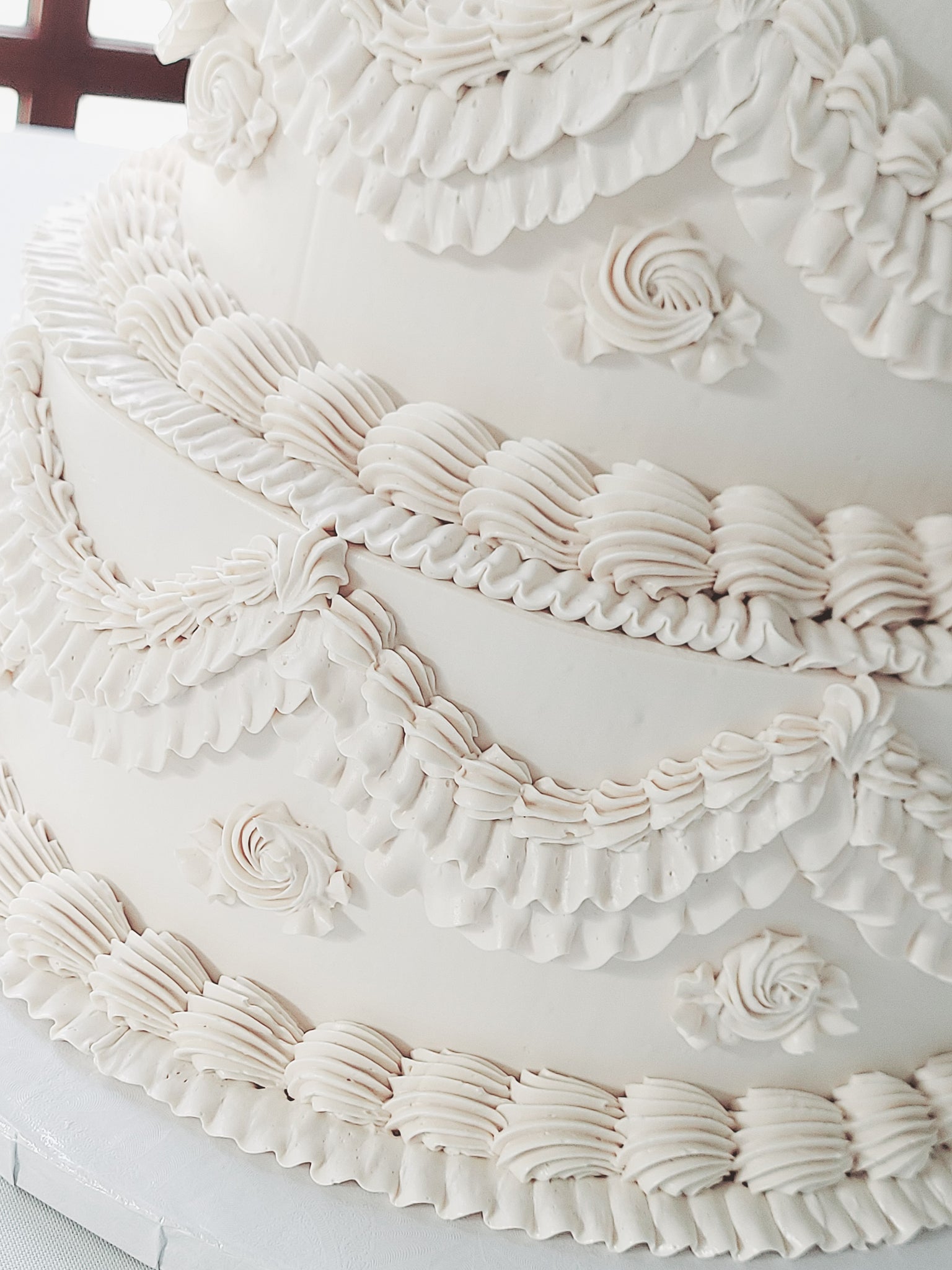 Perfect for weddings, anniversaries, or other events, any time of the year! Decorated with vintage piping for an elegant touch. Each tier has four layers of from-scratch cake, three layers of filling, and frosted with white silky smooth Swiss Meringue Buttercream. Cake will be on a thick white board.