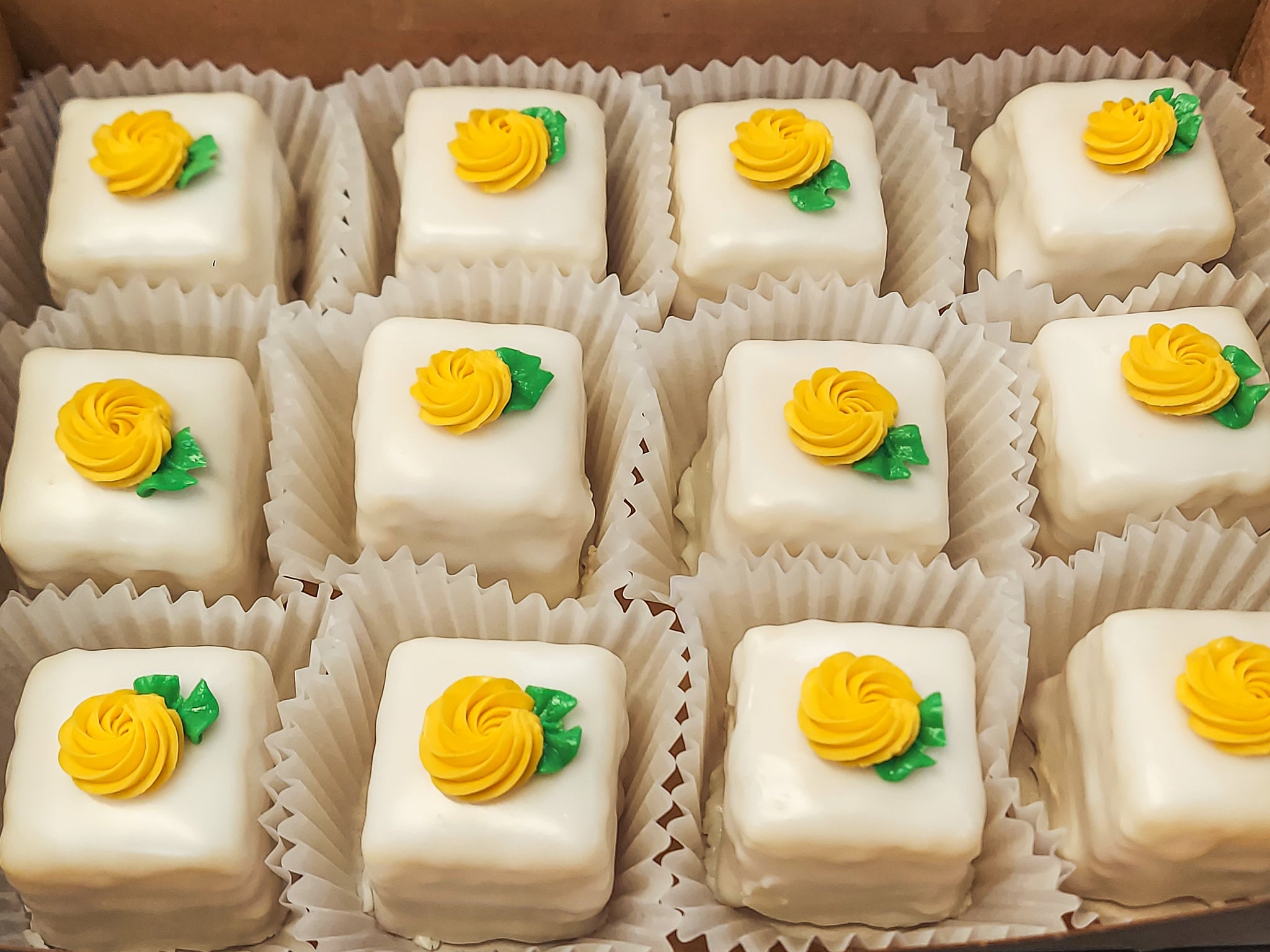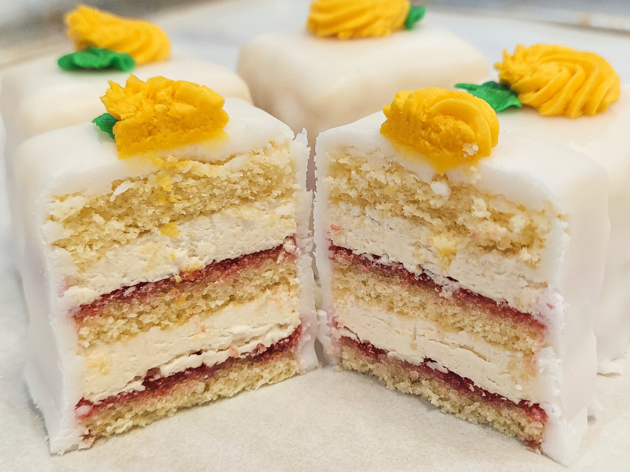 Be still, my beating sweet tooth! Our Fairy Cakes (a.k.a. petit fours) are little bites of heaven in a paper cup! Each 1.5 inch cake has 2-3 thin layers of cake and 1-2 layers of filling, depending on flavor chosen. Available in a variety of flavors and designs (some designs not yet shown; message us if you have questions).